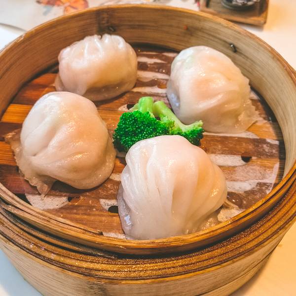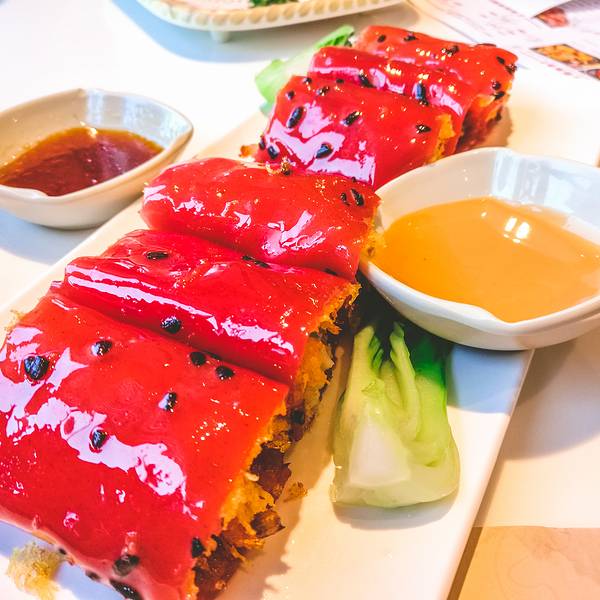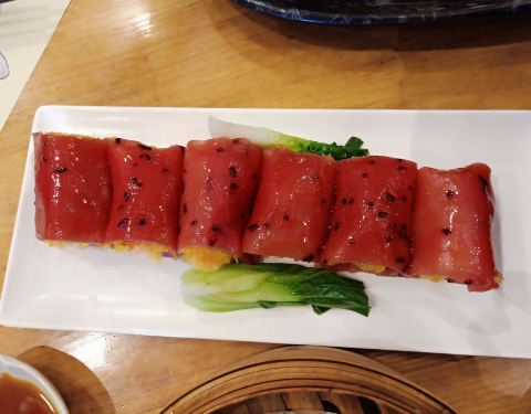 现代的外表,但本质仍是点心炒菜烧味烧腊齐全的粤式街坊大食堂,只不过这里的菜品更为精致一些。负责接待我们的大姐普通话讲得不是太好,而且感觉业务不熟练哈哈,上餐具都没给齐,有些丢三落四的感觉。点好餐,耐心等着上菜。清炒芥兰,上桌后拿酱油小料淋上一通,香气四溢,亮泽诱人,而且选用的芥兰也都肥得很。金丝芥末萝卜糕,外表酥脆,内里软糯,芥末味道时隐时现,但并不太呛人,主要还是外层那些色拉酱在中和着味道。雪花奶酪包,松软无比,夹杂着香浓的奶酪香气,吃起来不算太腻,有些清爽。传统虾饺必须强推,皮薄馅满,虾仁新鲜爽滑,肉足弹牙。香芋蒸排骨,比较中规中矩,给到的肉其实不算多,骨头啃起来有点费劲。五宝鱼籽烧卖,顶端透亮鲜红的蟹子极为抢眼球。