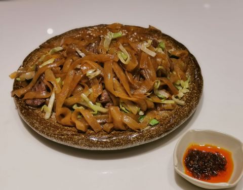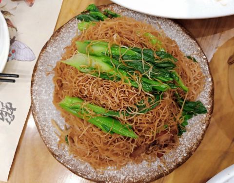 我在南方吃到的很多烧麦都会以糯米当做馅料,非常让我不能理解,但虾饺妹非常实在,虾肉和猪肉馅料的绝妙搭配,让人吃着深感畅快。古法马拉糕,非常大的一块,香软,奶味十足,吃起来还有蛋挞般的甜润。鲜虾红米肠,味道其实不算差,但与点都德的相比,差在了口感的层次上,外皮没有那么酥脆,用我们北方土话来讲就是有些皮了。沙爹捞金钱肚,软硬适中,比较入味。其实虾饺妹的菜量都蛮大的,三个人吃完上述这些后已经撑趴在餐桌之上,当最后的这一道头抽炒面上来时,彻底击碎了我们继续吃下去的信心——真尼玛多啊……