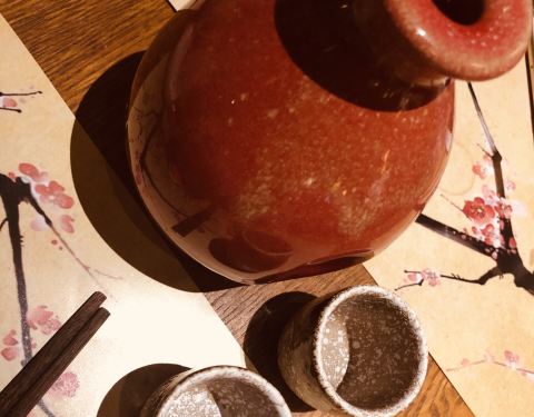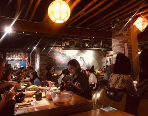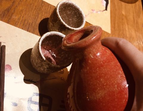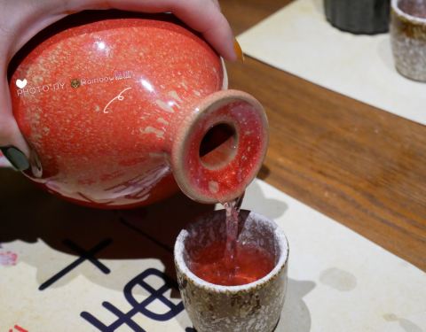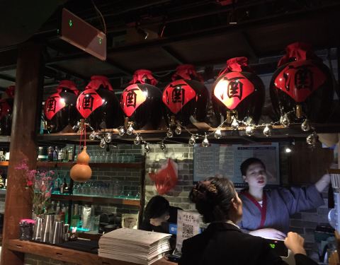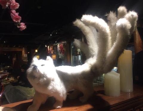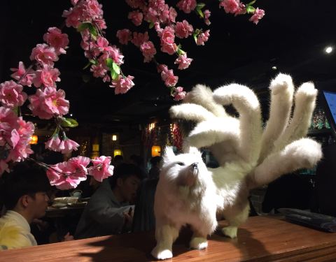 一家位置隐秘却生意暴好的店啊, 晚餐时间来顾客都满满排在门口了。 装修风格很青丘, 门口的白色九尾狐好傲娇哦。 很多种古色古香的酒可以选择, 味道很香, 很好入口。 菜品也有很多种类可以选择。 肥肠很好吃...