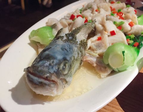 ♫|地点| 位于广州地铁3号线体育西路站。 (体育西路地铁A出口直走到广百) 广百南门的一条内街三楼 店铺的牌子比较醒目,不算难找 ♫|环境| 一进门就是一只显眼的九尾狐 布置得还是挺别致的,间隔比较明显,每个区都相对独立一些,不会相互有太大的影响 ♫|服务| 六点到店,有留座 不过其实还没满座 但是到了吃完离开的时候,外面等了不少客人 可见还是挺火的 而且等位的客人有爆米花提供 实名制羡慕 「三样菜」 22元 凉菜,价格和分量成正比 莲藕豆角跟苦瓜,麻酱跟口水鸡一样~ 应该算是下酒菜 「桃花酒」 小壶,25元 最近很多网红小酒馆都流行这种仙气十足的桃花酒 陶壶不大,大约就是六七杯的量 入口冰凉爽口,小酌怡情 「双味白灼鱼」 95元 清蒸,鱼身部分的肉嫩滑,但是鱼头非常腥。真真一鱼两味 不够味道的话还可以蘸酱油、辣酱。 作为位于鱼米之乡的广东人,天天吃鱼,所以对于这条鱼的总体感受还是一般般的 虽然大条,但是对于两个人吃来说,性价比并不是很高 而且可以多给点酱油