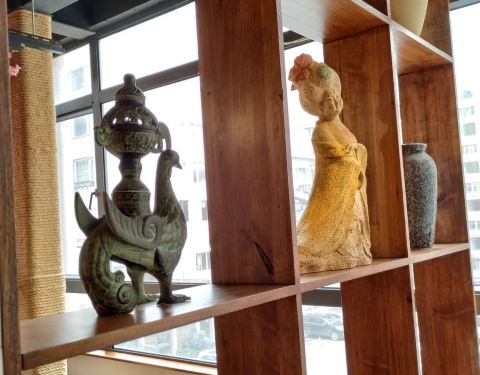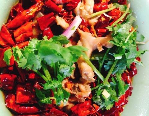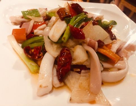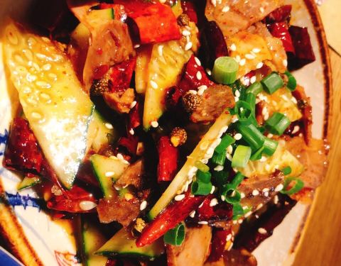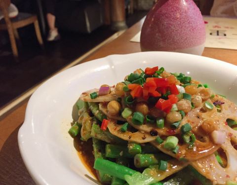 听到去过这店的朋友们都说这里不错的,于是就来试试。从体育西路地铁站走过来很近,位置不错,进了点了,环境有点神话,除了一只九尾狐的公仔,墙上还有一幅挺大的九尾狐和美女的图画,周围还有很多假桃花树,还有一些仿古董的摆件,古色古香,有点像是走进来“狐仙神话般的境地”。我们是在某个工作日的中午比较早就来到了,所以店里的人不多,我们找了一个窗边位置坐了下来,店员很快就来给我们开了茶位,服务态度挺好的。 因为我们不吃辣,也不喝酒,所以来这里其实不怎么合适,不过觉得瞧瞧环境氛围也不错。点了4款不辣的,感觉也不错啊。 (1)翡翠虾仁,45元。虾仁、腰果、芹菜粒、红萝卜粒,搭配色彩挺丰富的,每一样都挺爽脆的,好吃!不过吃到后面感觉有点油腻了些。 (2)清炒豌豆苗,25元。豌豆苗很嫩,一点渣都没有,很好!清新,正好可以解解前面的虾仁的一点油腻感。 (3)金银小馒头,12元。炸馒头和蒸馒头各有4个,都挺好吃的,很划算。 (4)小摊冰粉,9元。配了玫瑰花瓣的冰粉,挺漂亮的,可惜玫瑰花瓣吃不了,太干了,哈。还有核桃仁和葡萄干。冰粉很甜,不错。 (5)冰冻凉虾,9元。点菜的时候,我还不知道这个“凉虾”是什么,问服务员辣不辣的,她答到是糖水,哈,那我就知道甜品了,上来之后才知道是这样子的,小粉团,像是不规则形状的丸子,也是有葡萄干和玫瑰花瓣,这个“凉虾”没有冰粉那么甜,比较清新一些,我更喜欢这样淡淡的甜。 坐在这个环境是神话的餐厅里,听着悠扬缠绵的音乐,吃着精致的小菜,虽然没喝酒,也有点点醉意了,醉于这美好的氛围!