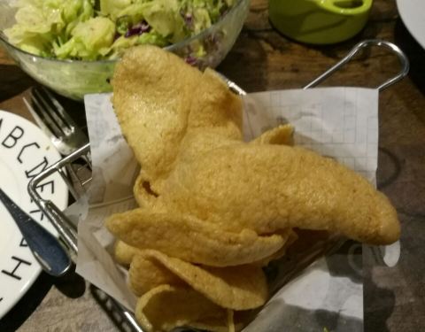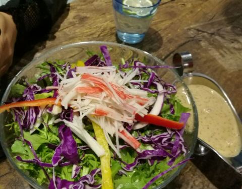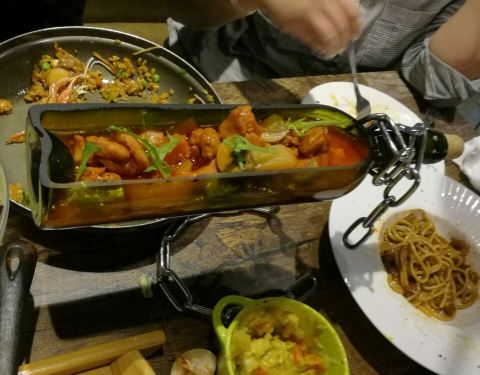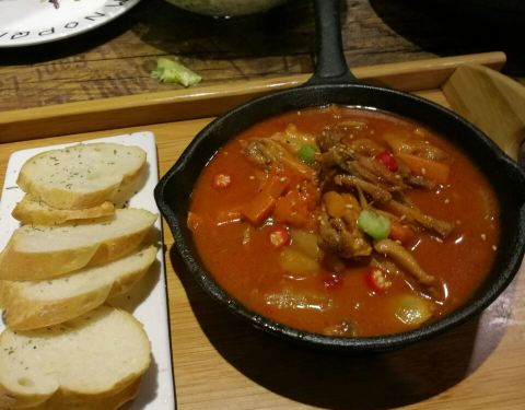 性价比很高,尤其海鲜饭真心好吃,饭比海鲜更有味道,建议下次在多放一勺米饭,要不爱吃的不够吃啊,在多点一盘吃不了浪费。芝士咖喱土豆泥相当入味,入口沙沙的绵绵的,浓浓的咖喱味,上边还有一层烤化的芝士,样子不起眼入口棒棒哒。红酒瓶亮点在于装菜品的容器,和变态鸡翅属于一个类型,一个是鸡肉,一个是翅,里边都是口蘑加土豆加胡萝卜,底汤是番茄,不管是肉和菜都入味了,变态鸡翅可以要微辣。沙拉和意面就比较中规中矩了,每家店都差不多,意面量小点。炸虾片比马路上买来的自己家里炸的要好吃多了。