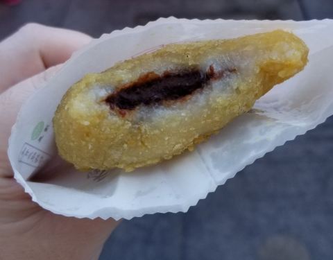 豆沙馅的糯米糕,炸过之后软、糯、甜,又不粘手,好吃。炸糕,记忆中的食物,看到了就买一个。大概是吧