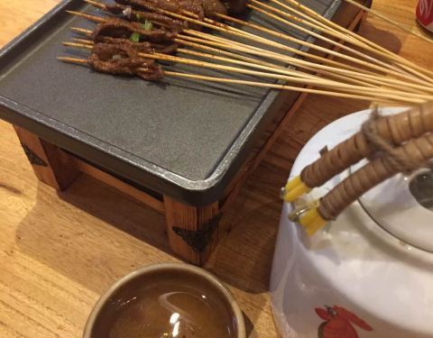 晚上生意很好的, 室内外都可以坐。 桌子不算太大的。点了好多水果酒和啤酒完了, 加上烧烤架子桌子都快摆不下了。 推荐的烧烤也是大家都喜欢的烤牛油。 滋味儿很足, 吃两把都不过瘾。 棒棒。 先是坐在外面有点冷, 后面坐在里面去了,毕竟那时候才三月份