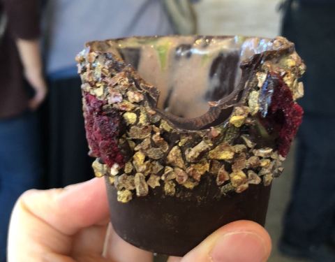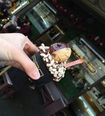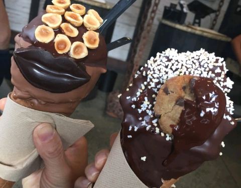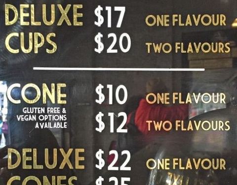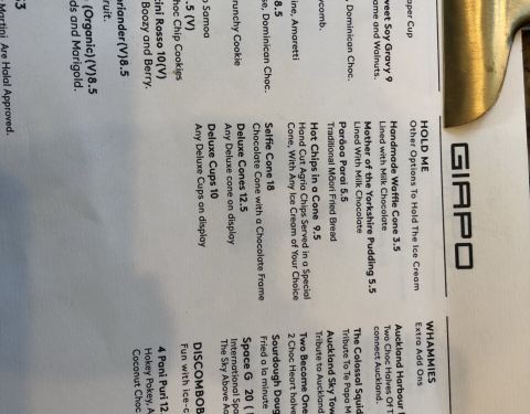 店铺不大,位于奥克兰港口码头不远处。排队人很多,上午去的估计排了20多分钟。进去后是一对一的服务,会先给你介绍、品尝。先选口味再选托架,口味估计有10种以上,每个口味一份是8-9元,再加第二份只需3元。托架有华夫饼或巧克力杯状的或其他各种形状的,价格有的甚至比冰琪淋更贵。我们选了一个巧克力味加抺茶味的冰淇淋外加一巧克力杯,好像20元左右吧。味道不错。
