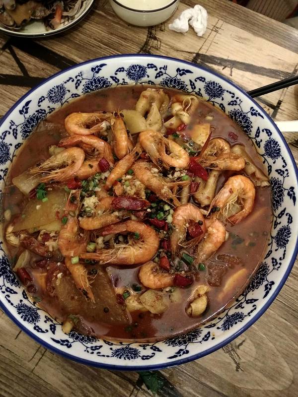 西栅出来后,找了这家《我行我宿拾年创意餐厅》。 吃的也是浙江菜! 炒花蛤,花蛤肉质饱满,味道刚好。 由于在西栅里买到了感冒药,对!没错!大过年的药店都不开门了,但西栅里的一家药店竟然有营业。让感冒的小姐姐放肆了一把,来了锅辣的! 古法三煲爽歪歪,我们选的是鸡爪和明虾,料很足,里面还加入了我们广东的腊肠提味。但缺点是鸡爪没有煮得软烂入味,没人让鸡爪完全吸收汤汁的味道。