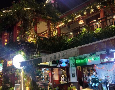 在西街那条老外美食街上强烈推荐这家店 美团价特别实惠 披萨很大份一个才58元还送一杯美式cafe 每个座位摆放的有娃娃和鲜花 用餐环境很好呦 老外超级多!哈哈老外吃披萨都是一人一大盘的餐厅外的桌子 敲好看少女...