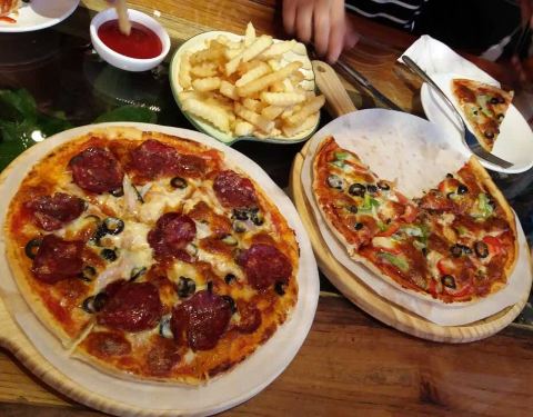 这家餐厅是传统的意式柴火薄饼披萨,我们点的两个披萨,美式鸡肉披萨和萨拉米香肠披萨。外加一个沙律,和一个薯条。意式薄饼披萨味道真的很好吃,其他餐品也很不错。整个餐厅被绿色植物覆盖着,显得绿意盎然,很...