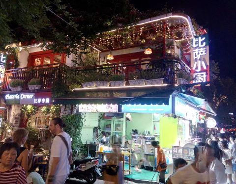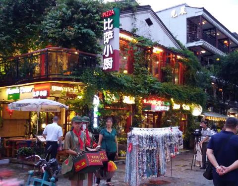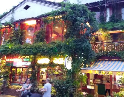 在西街那条老外美食街上强烈推荐这家店 美团价特别实惠 披萨很大份一个才58元还送一杯美式cafe 每个座位摆放的有娃娃和鲜花 用餐环境很好呦 老外超级多!哈哈老外吃披萨都是一人一大盘的餐厅外的桌子 敲好看少女心的娃娃和鲜花💐嘻嘻桥上全是油纸伞哦