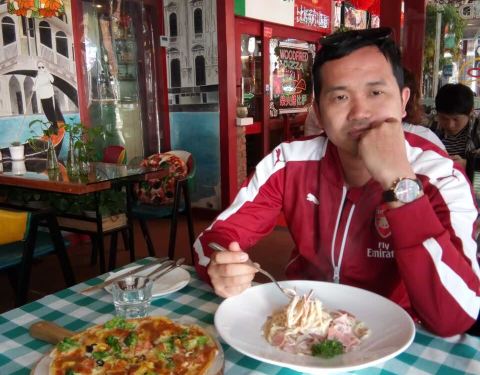 这家餐厅是传统的意式柴火薄饼披萨,我们点的两个披萨,美式鸡肉披萨和萨拉米香肠披萨。外加一个沙律,和一个薯条。意式薄饼披萨味道真的很好吃,其他餐品也很不错。整个餐厅被绿色植物覆盖着,显得绿意盎然,很有热带园林的感觉。餐厅经理是个德国的小伙伴。