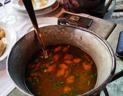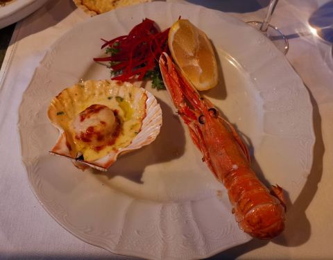此行中最贵的一餐,人均300多人民币,主要还是因为经营海鲜为主,餐厅环境很好紧挨着湖边,服务到位,我在集市上买了一束白菊花,在餐厅吃饭时服务员主动拿上来一个花瓶,花瓶中放上水。点菜时准时为难了,很多海鲜叫不上名字,只能是翻译软件加比划,价格也顾不上问,最后点了一道汤和海鲜拼盘。因为吃海鲜,所以在朋友的提议下又点了一瓶白葡萄酒。饭店还有叫车服务。