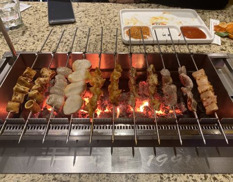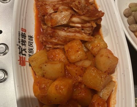 人气很旺的烧烤店,原来是韩国的店。 比较特别的是烤串是可以自动烤的,机器会动,串会自动滚。 串品种挺多的,就是每串不大,几口就没了。 羊肉不错,羊味挺重的。猪皮推荐,很q弹。 烤面包推荐,一开始烤糊了,店员看到主动帮换了个,还帮忙烤。皮脆肉甜,松软可口,推荐。 泡菜是要花钱买的,买了拼盘,感觉腌的生了点,不是太酸爽。 调料挺特别的,有四种,按需搭配。蘸酱甜了点,特辣包其实不太辣,还挺喜欢的。其实大多串有腌过,所以也不用蘸。 冰淇淋是免费的,俄罗斯冰淇淋,比较香浓,可以去试下。
