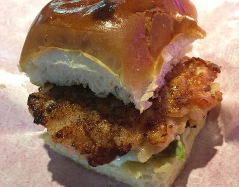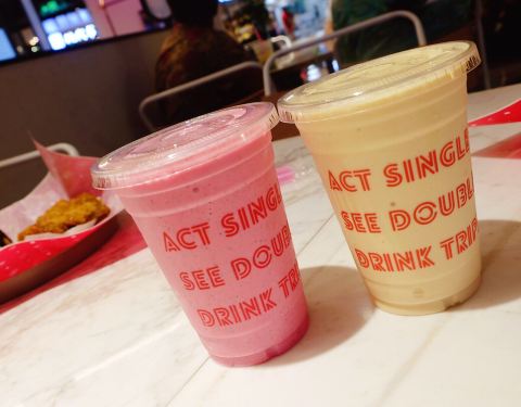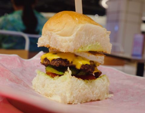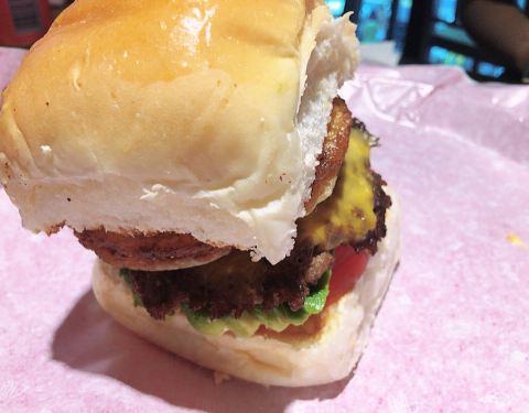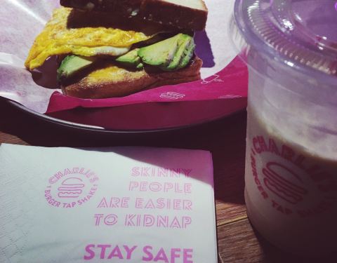 鸡尾酒奶昔,喝着喝着就脸红了☺️而布朗尼蛋糕夯实得堪比压缩饼干,放在掌心沉甸甸的如同粉色炸弹,虽然没有核桃坚果仁丰富口感,但吃起来也是相当有嚼劲的说 对他们家牛油果炸虾汉堡情有独钟,粉粉惹人爱的包装纸将其裹起,虾仁和虾糜搅和后融为一体,里面还包裹着爽脆马蹄粒,鲜嫩多汁劲道Q弹回味无穷。而首屈一指的汉堡面包也确实做到像云朵一样蓬松软绵☁️难怪人家说,吃过这家店的汉堡后,感觉其他的馅料都成了配角,哈哈哈