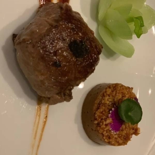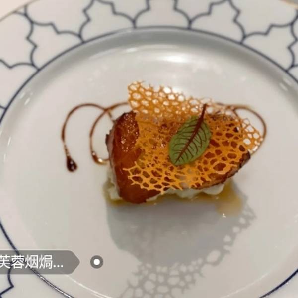芙蓉烟焗银鱼,无骨,不腥,但个人更喜欢日料店里,略带甜味的口感 松露和牛礼物盒,外层和牛,切得很薄,煎得偏硬,里头裹着切得很碎的松茸菌菇颗粒,很香。