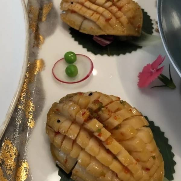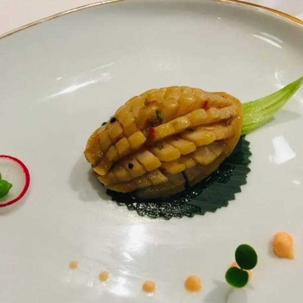 听说有午市套餐,但还是选择了单点,选了一些这边的特色推荐菜。 冰镇清酒冷鲍鱼,餐前凉菜,一个鲍鱼一切二,一口半个,没有酒味,非常嫩