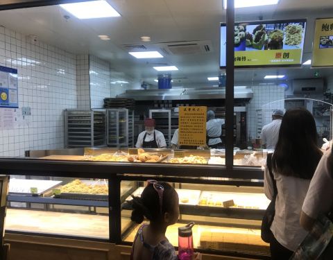 开了一阵子了,最近去买一般排队十来分钟就可以买到了。品种不多,除了肉松小贝,大部分是应季的月饼。多几款蛋糕就好了,榴莲口味的那款榴莲味不太浓