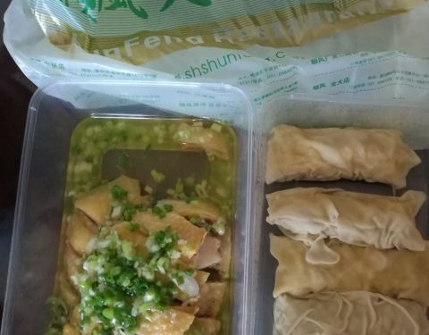 顺风大酒店的食品外卖外包装袋封口了,卫生,安全。葱油鸡量少油多味道美