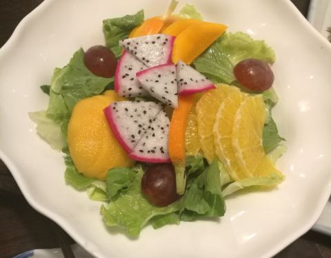 - 【老油条牛肉】口感有嚼劲,但味有点重;【百香芒果甜橙沙拉】用百香果的味道调沙拉,很棒,很爽口