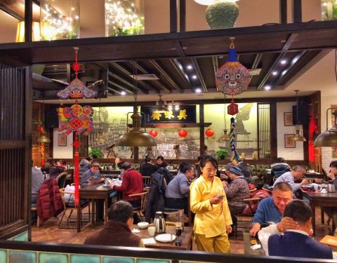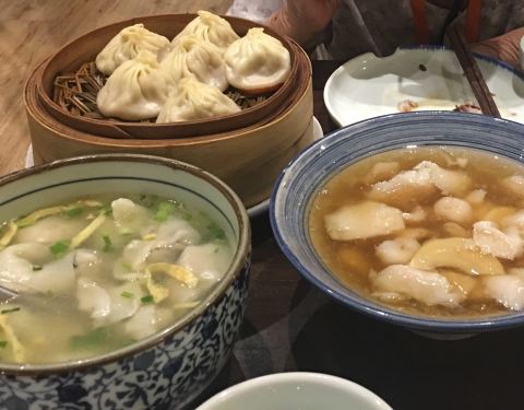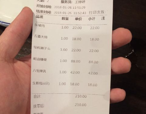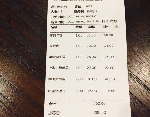 楼后面的院内有停车场,车位比较充足,餐厅有Wi-Fi,工作日晚餐时间到店,拿号等位大约10-20分钟。 上海菜对于我这种北方人来说,吃多了会觉得腻,但许久不吃又有点想。 排骨年糕,甜咸口,很入味,烧得也很懒,容易脱骨,个人口味偏淡,所以这个菜对我来说偏重了;叉烧肉,调味汁比排骨年糕的味儿淡一些,很适合我,而且肉肥而不腻,老少皆宜;上海小笼,做得实在是没法和上海比,肉偏死,不够香,感觉肉馅搅拌不够,而且糖欠些,包子皮也快赶上北方包子的厚度了;两种馄饨都是皮偏厚,尤其是菜肉馄饨,分量十足,感觉两个人吃一碗合适。