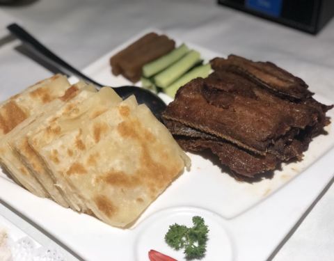 北平楼烤鸭店在田村京良广场的三层,楼下有充足的停车位,这家店的面积挺大,装修比较上档次,烤鸭外酥里嫩鸭饼柔软,贝勒爷烤肉味道正