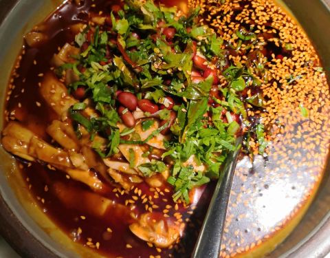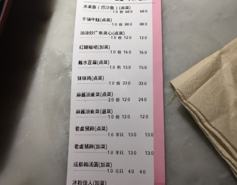 门口排队人很多,但是只要提前一天电话订位就可以不用等了。提前有电话预定,店员说只能订晚上19点的,早到了会,实际18:45分左右就能进了。提早订位,提早订位,提早订位,重要的事说三遍。 自助扫码点单,餐具等在抽屉里自取,但是餐具是缺的,还要找服务员拿。 菜量挺大的,味道还行,价格便宜。 麻酱油麦菜 12元,钵钵鸡 33元,招牌菜必点的 油渣炒广东菜心 12元,用油渣炒菜心好吃 水煮鱼 68元,巴沙鱼,鱼肉很嫩,豆芽很多 干锅牛蛙 88元,偏咸,配菜很多,有藕片,薯片,莴笋等,牛蛙腿不多。 老卤猪蹄 半只13元,有点硬,蘸水豆腐 15元 点心点了:红糖糍粑 16元,冰粉佳人 4元一位,成都赖汤团 4只4元。