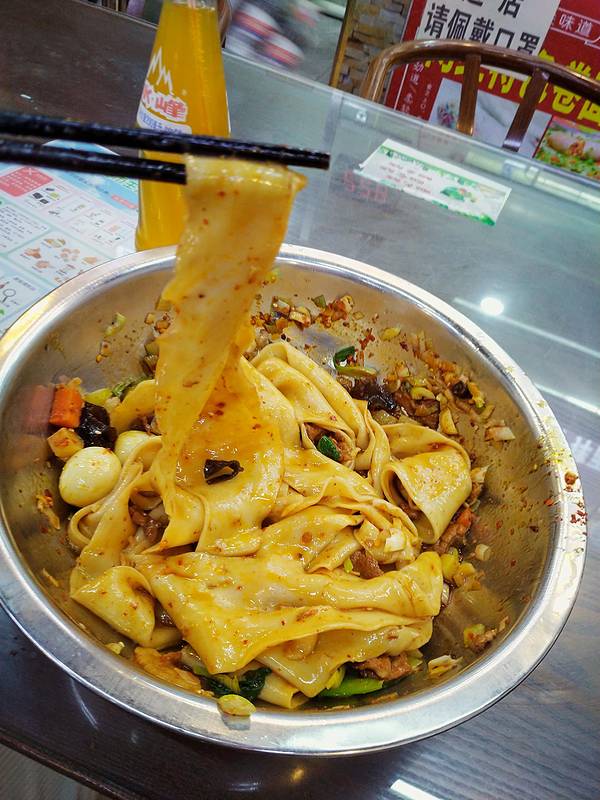 爱骅裤带面馆(biangbiang面7分)20元 拿到我面前的时候我整个人都傻了,干饭人吃饭得用盆?tmd根本不是用碗装的,就用个钢制的脸盆装着。至于裤带面那我觉得真是见笑了,叫裤头面还差不多,巨粗一根,比裤带粗多了,内容的话,切了点肉丁、土豆丁、芹菜根、红萝卜丁拌了一下,一股酱香味,这种酱香味对湖南人来说比较常见,家里常炒的辣椒炒肉、芹菜炒肉、豆子炒肉那种酱香就那味。