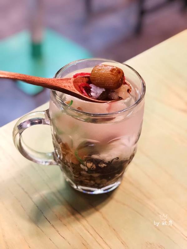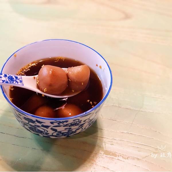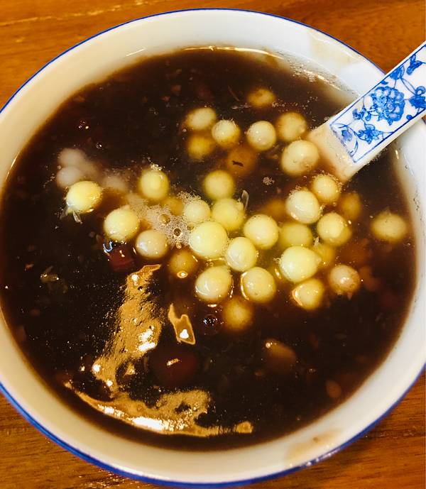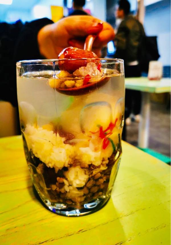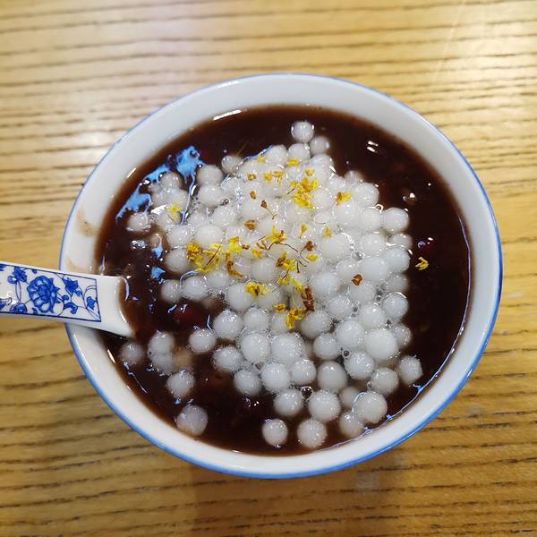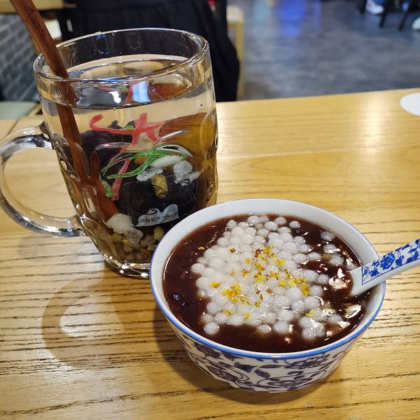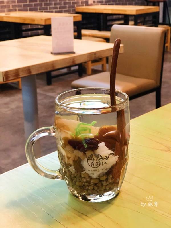 乌米冰镇绿豆汤和我想象中不一样,满满一大杯,可以形容为冰薄荷水泡八宝粥。绿豆、赤豆、蜜枣、冬瓜糖,一大坨紫糯米甚至还有青红丝。总之是比较奇怪的味道,个人认为还是北方的绿豆沙冰比较爽,一杯满足。乌米冰镇绿豆汤桂花赤豆小圆子就中规中矩,如果知道绿豆汤是薄荷水八宝粥的话我是绝对不会再来一碗红豆稀饭的(捂脸)桂花赤豆小圆子