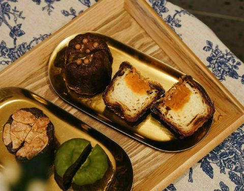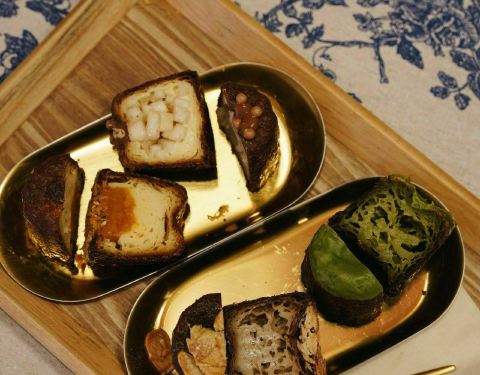 紫苏巧克力蔓越莓奶酪 花吃紫米乳酪 芋泥面包 红薯麻薯 杂粮黑朗姆凤梨 伯爵红茶奶酥 老干妈泡菜牛肉 苏丹王榴莲 日式盐面包 山楂树芝恋