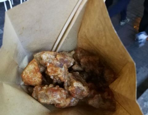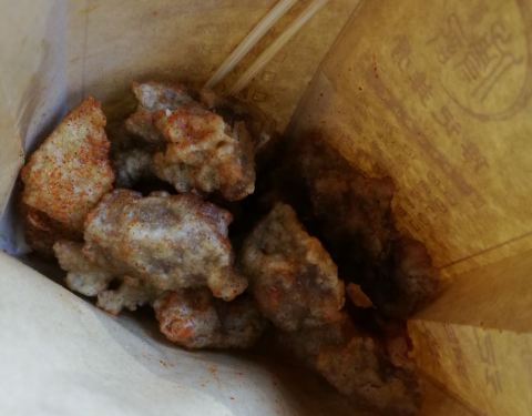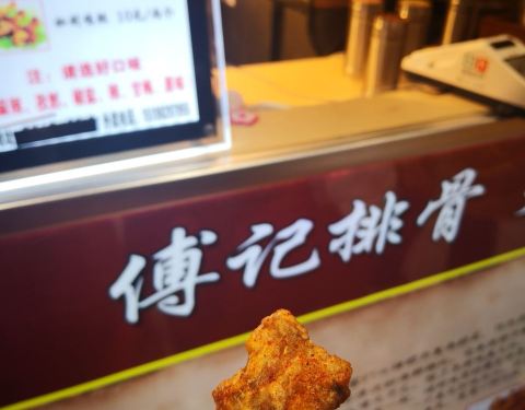 在点评网上秒杀到的小份排骨,价格相当便宜,趁着到建设路逛耍就过来领。还差10分钟到5点,店员说得等到5点才能领。我又去其他地方吃了东西过来看到门口排了两三个人。因为之前看网上介绍这家才是资格的傅记排骨,隔壁大概几十米远是仿的,结果假的那家生意居然更好,起码排了10多人。有个胖店员问要什么味道,就要的麻辣味。排骨炸的火候还把握得不错,有点香又不会太干,里面还有几个鸡排还可以。路过的时候来尝尝当小吃还是可以的。