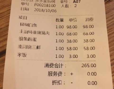 住在花间堂里,晚饭也不想出去吃了,直接花间堂里面吃,失望。服务员聊天嬉笑,服务态度很差,点单也很慢,自己拿菜单,自己倒水,在搞什么? 主厨特推黑猪肉 68元,不是现烧的,加热也请好好加热,温的,猪肉肥的部分是硬的!毛也没有处理干净,这个还是招牌? 秘制白鱼 98元,就是蒸的白水鱼,还不是新鲜的,腌渍过的,咸的。好不容易来了个服务员点单说这个菜要等1个小时以上,我说没关系我就住花间堂,事实是半个小时不到就上来了。 银鱼跑蛋38元,很油,南浔烧三鲜 58元,米饭3元。口味不如景区里其他几家店,服务很差 第二天花间堂的早餐也是这里的,服务还是不怎么样,有面小馄饨等,问了服务员说面是什么面,回答说是有浇头的素面,可是一看就是红汤光面,哎~~好在还有蛋饼等可以吃吃。