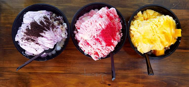 - 刨冰是直接白冰块刨好加料,味道一时半会难以渗透进冰里。有一种冰冻的可乐最后剩下白冰的感觉