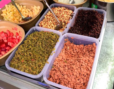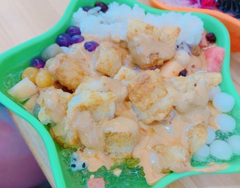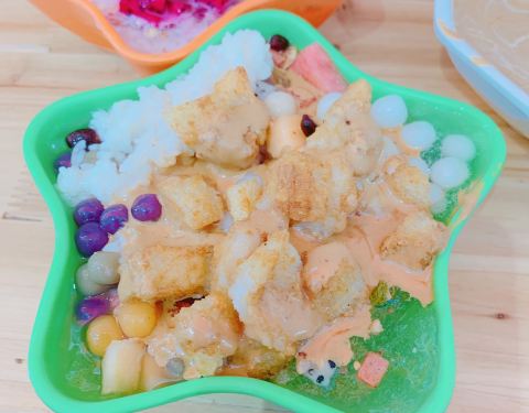 刨冰是直接白冰块刨好加料,味道一时半会难以渗透进冰里。有一种冰冻的可乐最后剩下白冰的感觉。 串妹的特色雪花冰点好单,发个碗,自己去制作处取,看着实物制作是把各种口味的料已经冻成了各色的冰块,再刨出绵绵的冰来。芒果味、草莓味、蓝莓味、巧克力味,集齐丰富的颜色。哦,夏天应该有的味道。