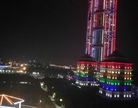 酒店高308米,有七十七层,顶楼是世界最大的旋转餐厅,服务优良,只是价格偏高,自助餐也要一百多一个人
