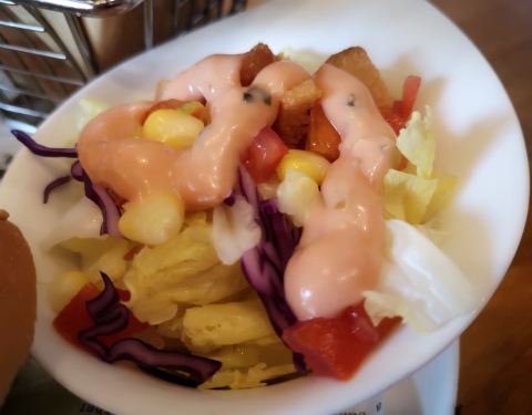 环境比较普普通通吧,反正从外观还有里面来说都只能够说是相当普通的一个西餐厅,有两层楼,二楼的楼顶会低一点,还是坐在一楼这边比较舒适,而且座位也是比一楼宽一点。