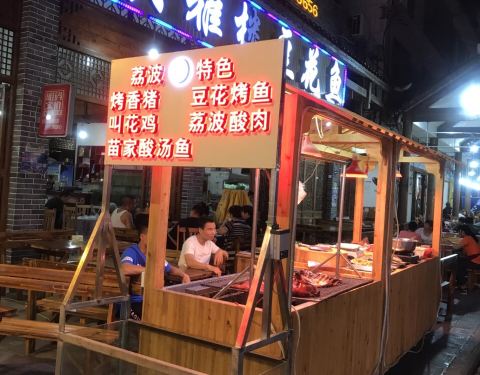 荔波美食街。这条街全是饭店跟烧烤,可以选的吃的东西不多,美食街小小的,十几分钟可以走完。吃鱼的当地人推荐吃刘一手,除了豆花娇嫩外鱼并不好吃。特色还有烤香猪,丝娃娃,包酱豆腐,潘奶冰粉等等。
