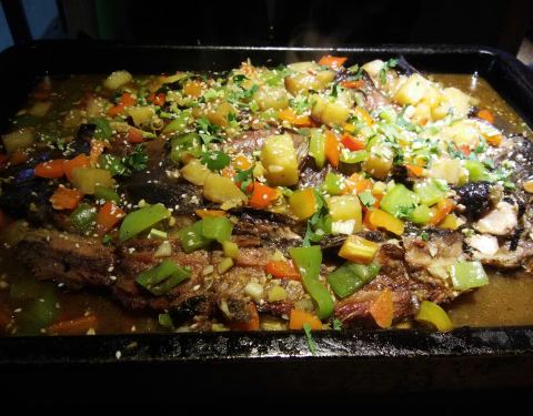 来滨州在万达广场看到的这家店,点的青花椒味烤清江鱼,味道不错,肉质鲜美,2-3个人吃的量。红糖冰粉也比较清口,特别是吃辣一点的菜时。大叉烤肉量太大,适合人多或者男士吃,整整三大串,应该是鸡肉,几位女士吃不了。