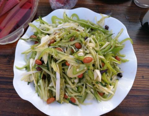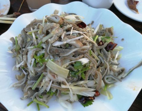 特色的凉拌红梗,就是山楂的味道,非常酸,略带甜,大家都觉得稀奇,每桌都去点