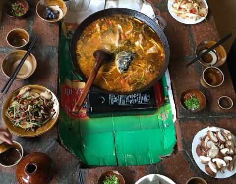 店面不大,装修比较简洁,桌子普遍做的都不高,椅子都是木桩凳。我们坐在了二楼临街那张用砖砌成的类似于灶台的桌子前,还是别有一番风味的。这家店在网上有2-3人和4-6人的团购,相对性价比还是可以的。我们选了当地比较有特色的酸汤鱼,酸汤鱼味道有点酸酸的,类似于冬阴功,不过偶尔食之味道还是不错的,鱼也很鲜嫩。套餐里附赠了很多菜品,还有一壶米酒。米酒可以尝尝味道,不过我们都不胜酒力,只是浅尝了一小杯,真是有点可惜了那壶米酒。