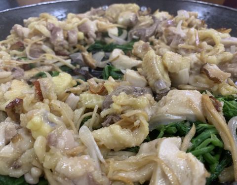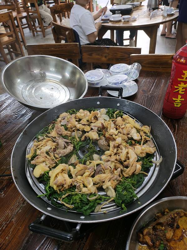 桑拿鸡也很不错,鸡架拿来做汤底,味道特别好,鸡肉垫的是桑叶,好吃有特色。 这一餐吃得很满足