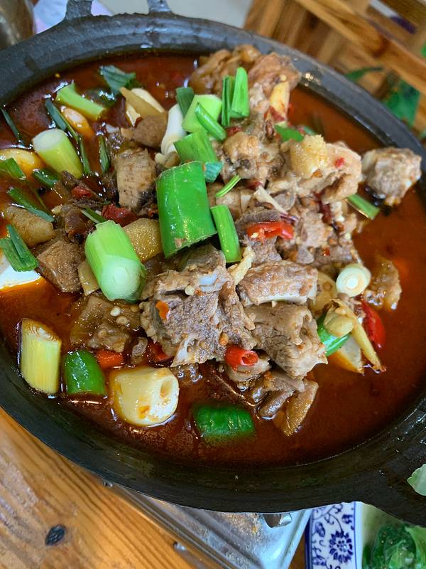 挺好吃的。份量很足,炖鸡吃不完打包带走。看到后面来的两个老外只点两个菜就够吃了,挺会节约的。 - 青椒腊肉,腊肉特别正宗,很有味儿