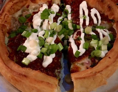 The Mexican pizza is so good! Chile verde with carnitas, onions, cheese, sour cream