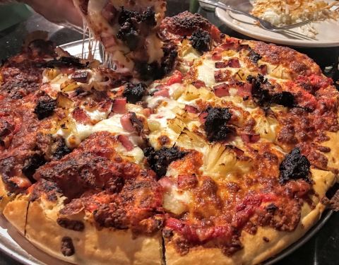 The pizza was a too bready. The "Hawaiian" pizza was made with pulled pork, but the pork was burnt.
