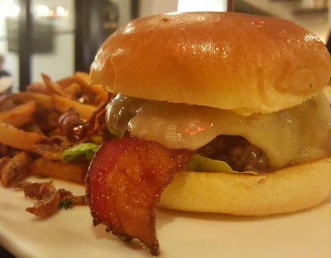 The delicious Bacon Cheeseburger comes topped with pecan-smoked bacon, Vermont cheddar, and delicious pickled zucchinis.