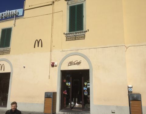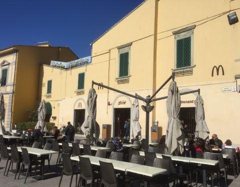 比萨。距离比萨斜塔最近的一个麦当劳,有户外座,还有麦咖啡。麦咖啡是唯一进入意大利的国际连锁品牌,星巴克就始终没进来。 这个麦当劳在奇迹广场的入口处,地理位置好。