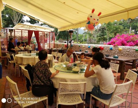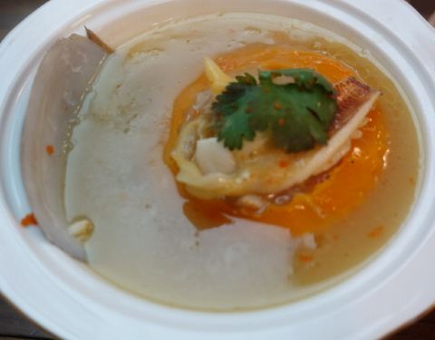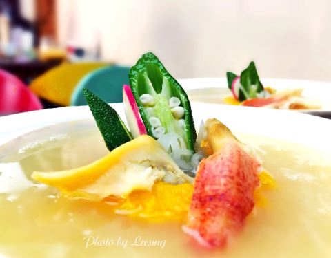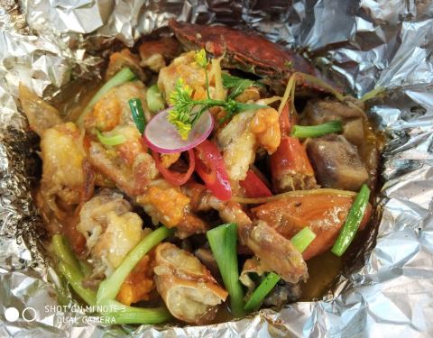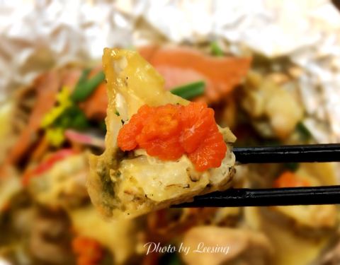 环岛路这边有好几家餐厅都是类似的这种别墅餐厅,其中这家让我还蛮惊喜的,进餐厅前的那个wedding park,台阶和两边的花草都让人觉得十分精心装修,显得非常别致。店里室内室外都有用餐的空间,但感觉室外的环境会好一些,不过夏日可能会有些热。 「家传养生粥」点的菜里上的第一道就是养生粥,这个竹筒看着非常美观。养生粥的汤汁儿实在是很赞,海鲜的鲜味儿渗到了米饭里,米粒软糯,每一口都觉得很暖胃。 「当红鸡蟹舞」直到上菜后,我才明白这菜名的意思,就是用锡纸包裹着鸡肉和蟹肉,在火舞中渐渐散发出香味,让客人更加能感受到色香味俱全吧。这道菜的确不错吃,切成一块一块的满满蟹肉,黏腻的蟹膏和紧致的蟹肉瞬间撩开我的味蕾,是我这种蟹肉爱好者的心头好了 「芝士焗榴莲」在海鲜餐馆里竟然能吃到榴莲甜食,榴莲控感到非常满足了。上面是一层厚厚的咸芝士,底下是榴莲果肉,还不错吃。