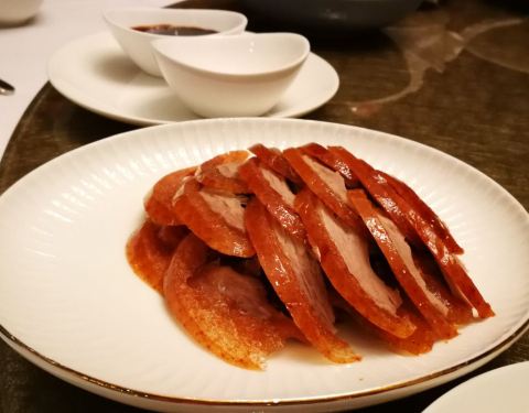 欢迎远方来客,家里领导在这家餐厅组织了次小聚会,订了个半开放的半包房,空间、视野都不受局限,而且最低消费也比包房便宜的多。停车要停到LG2超市旁的车位,乘超市内的电梯到四楼就可以直接进餐厅,还可以顺便欣赏一下透明厨房和烤鸭炉,和大厨打个招呼。商厦内其他电梯都只能到三楼,再想找到四楼的餐厅就有难度了。一年前来过一次,现在餐厅内已没有装修味道了,装潢色调觉得清冷了一些。菜总的来说虽然贵,做的还很不错,特别是烤鸭,德国朋友吃的不亦乐乎。服务则明显跟不上,似乎人手严重不足,要一小碟醋,茶壶加点水,没有十分钟再去催根本做不好,甚至还发生把要加水的茶壶直接收掉的举动;还好服务生反应能力还是有一些,我们质问之后立即打招呼重新泡了一壶上来。至于菜嘛,直接看照片吧。另外,这次看了下餐厅的室外平台,没意思,景色难看土气,今后不必考虑