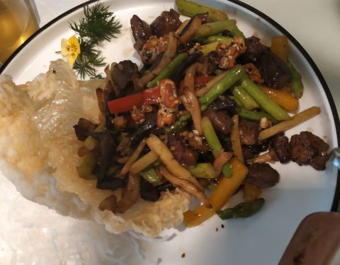 - 野山菌炒安格斯牛肉粒,意外地好吃。 它家菜都还不错,除了贵点儿没太大毛病