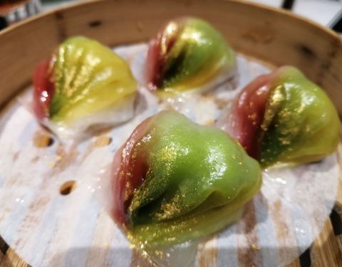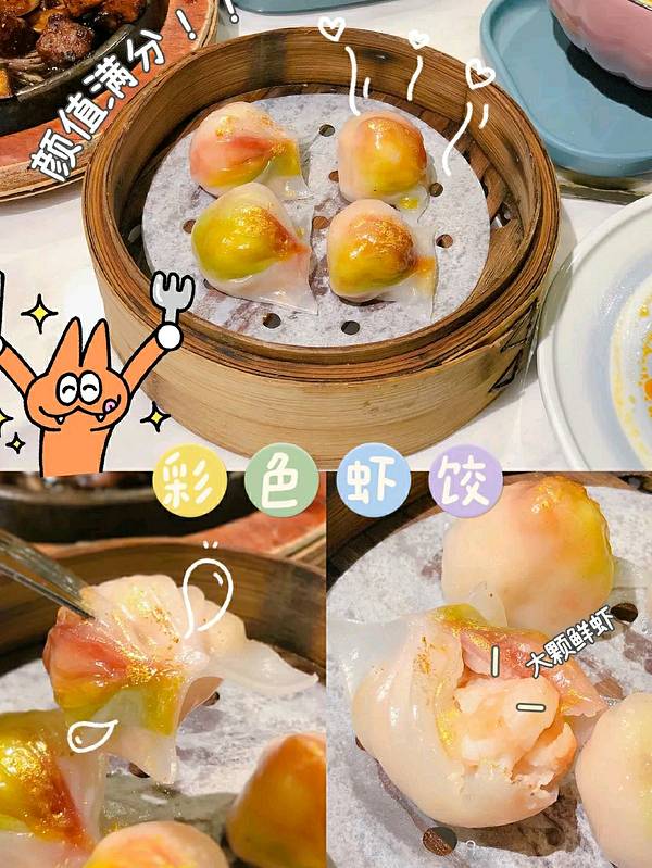 🥟彩虹虾饺 虾饺表皮时渐变色彩,撒上了食用金箔,简直美到要哭!咬开外皮,里面夹着大大只鲜虾,口感爽甜,无论颜值和内涵都满分!