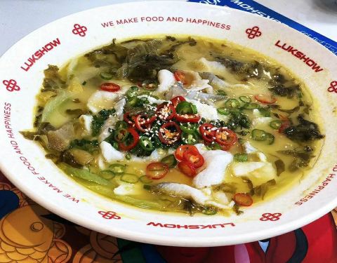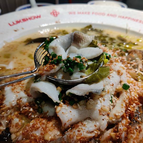 位于侨鑫国际商场二楼,连锁酸菜鱼专门店,装修风格都是中国式的红红火火恍恍惚惚,进店就闻到一股香浓的辣椒油味,晚饭时间基本都要等位,建议提前拿号。个人比较喜欢这里酸菜鱼的口味和配菜选择多,出品的鱼肉嫩滑,没有鱼腥味,推荐配肥肠和金针菇,不能吃辣的也可以试试爆炸葱香味或黄金蒜香味,口水鸡作为前菜比较开胃,鸡肉有点弹牙,鸡皮不肥;上汤豆苗鲜嫩可口,汤底浓郁,也适合解辣;饭后再来个红白甜品,清凉一下,甚是满足。总体来说服务比较到位,出品各分店水准一致,能加大优惠力度会更亲民