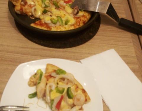 披萨速度太慢了,吃的东西味道还可以,点餐没有用机器还是人工手写,吃的小龙虾披萨上图给大家看看,材料太少了。